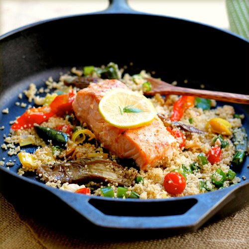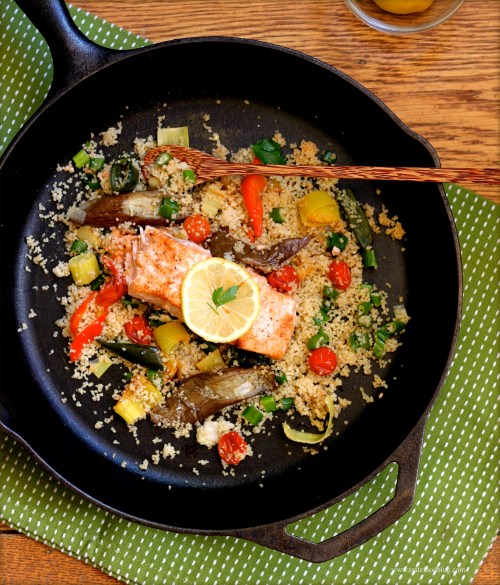 ~ Salmon, Cherry Tomatoes, Eggplant, Peppers, Leek, Couscous ~