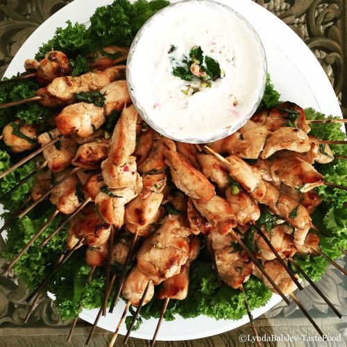 Pomegranate Hen Skewers with Yogurt, Mint, and Pistachios