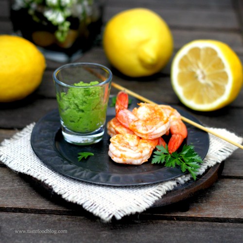 ~ Grilled Shrimp with Garlicky Pea Purée ~