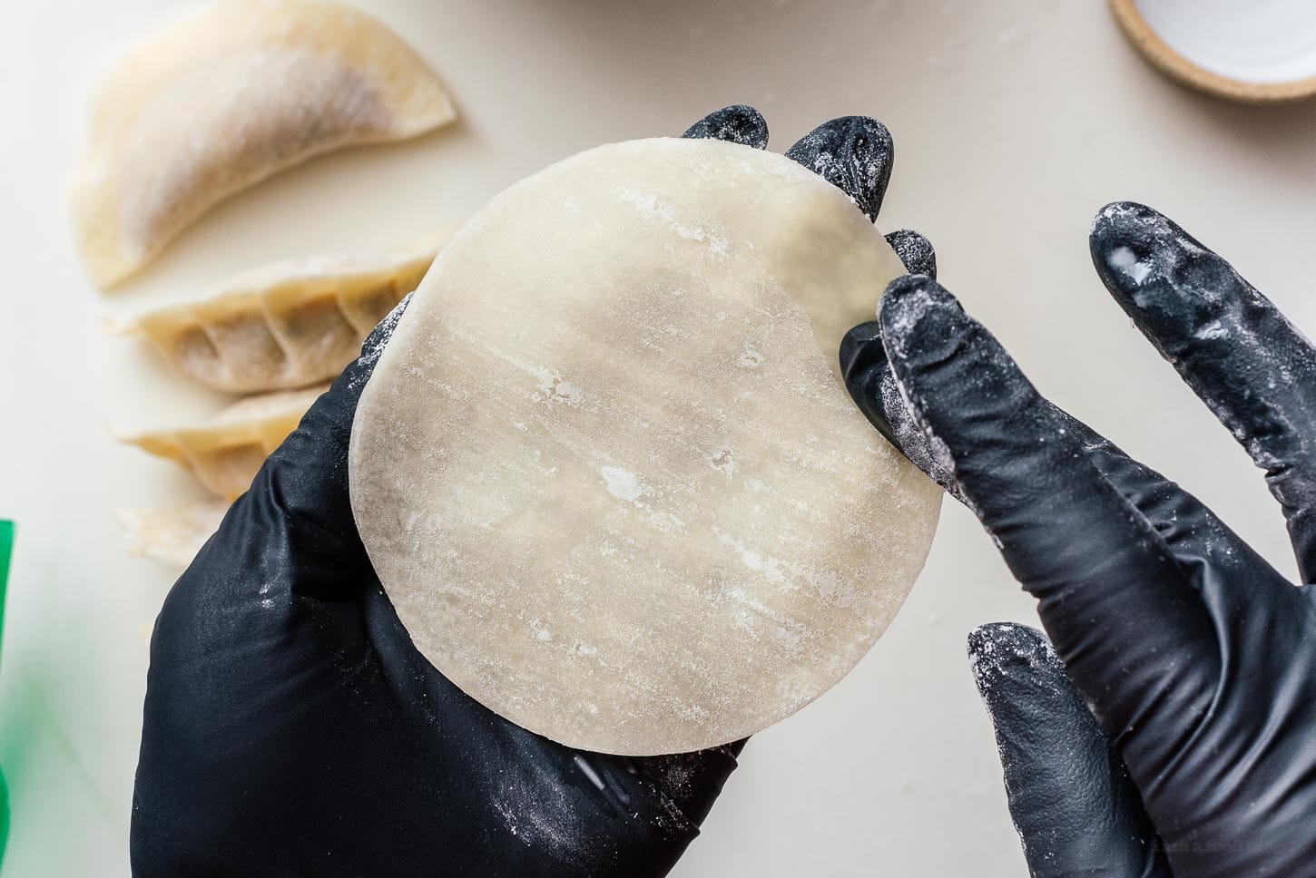 - Use a 4 inch cookie cutter to chop out spherical gyoza wrappers, flippantly dusting and overlaying the wrappers with plastic wrap so that they don’t dry out.