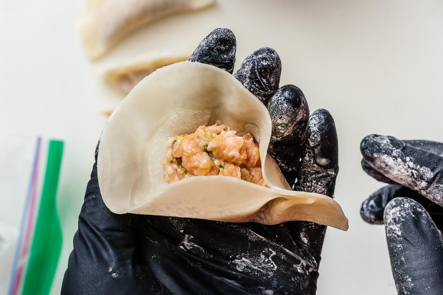- Wrap. Add a tablespoon of filling to the center of a spherical gyoza wrapper, flippantly moisten the perimeters and pleat and press collectively the perimeters.