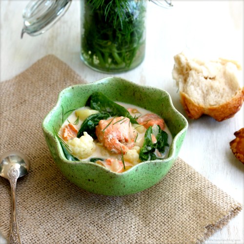 Warmth the oil and soften the butter in a big pot over medium warmth. Add the onion and sauté till softened, about 2 minutes. Add the flour and cook dinner, stirring, 1 to 2 minutes. Add the water and whisk to mix the flour. Add the potatoes and cauliflower. There needs to be sufficient water to cowl the greens. If not, add extra water to cowl. Simmer, partially coated, till greens are tender, 15 to twenty minutes. Stir within the paprika, Tabasco, and cream. Deliver to a simmer. Add the salmon and simmer till cooked (or heated) by. Stir within the spinach and briefly cook dinner till vivid inexperienced in shade and wilted, about 1 minute. Season to style with salt and pepper. Ladle into soup bowls. Garnish with recent dill and serve instantly.